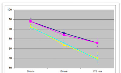 ![]() Upptaget av insulin avsatt mot tiden i minuter (x-axeln) |